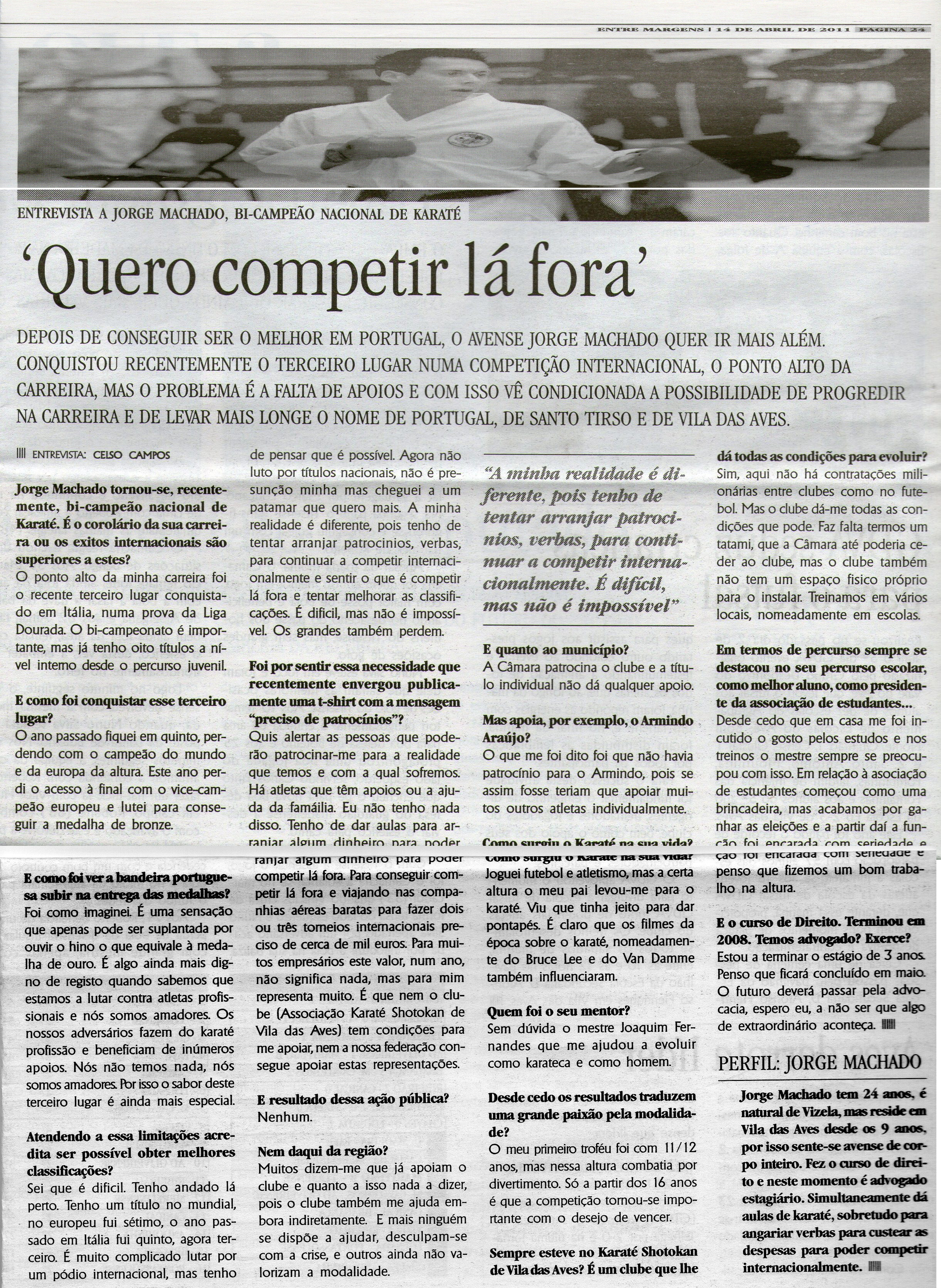 O atleta Jorge Machado foi seleccionado para integrar a Selecção Nacional que irá representar o País no 46º Campeonato da Europa de Karate Sénior, a realizar em Zurique – Suiça, nos dias 6 a 8 de Maio.